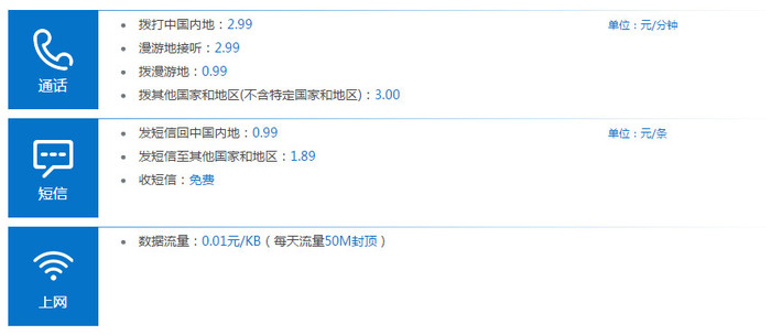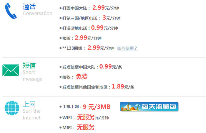 - (500MB+20RF):500MB,支持2G/3G/4G,剩余20RF话费剩余,免费接听。有效期:激活后30天。