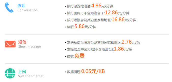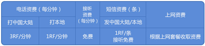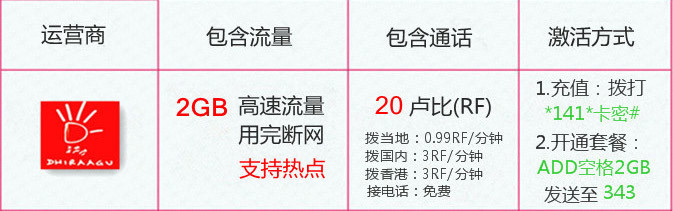 - (2GB+20RF):2GB,支持2G/3G/4G,剩余20RF话费剩余,免费接听。有效期:激活后30天。