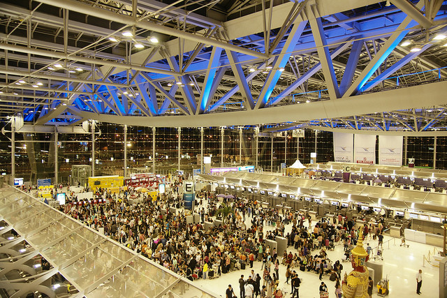 亚洲最大的机场,照片中为四楼值机大厅,其中拍下的只是其中的一个角落,每一个类似的值机区域,都有一尊佛像,在机场的正中央,供佛着舍利子