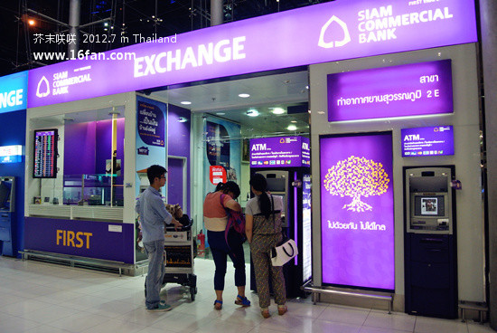 二楼到达大厅一直沿路向前走,到尽头有ATM机子,提款机可以直接用银联卡取泰铢。
