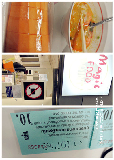 一层8号门边的Magic Food,很平价餐厅,和外面的价钱差不多。一楼大厅内,面对出口最最最左手边。东西真的是超级无敌便宜,进门左手边的柜台拿泰铢去换餐券,我们每人换了100泰铢,100泰铢可以点客饭和一杯鲜榨果汁或者是新鲜水果。