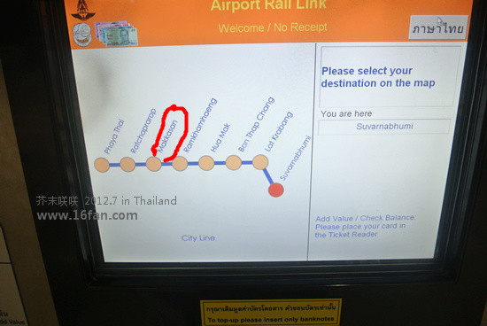 自助机子上有英文页面的(语言切换按钮在右上角)。红圈圈起来的那一站就是Makkasan站,换成地铁在这站下(如果你订的酒店也是地铁沿线的就在这站下了换成地铁哦~)