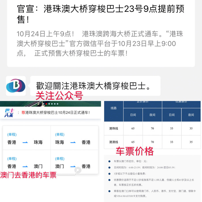 可以到澳门口岸后排队买穿梭巴士的车票,也可以关注“港珠澳大桥穿梭巴士”的公众号购买澳门到香港的车票,票价人民币58元。推荐关注公众号购买,不用排队,更加方便。