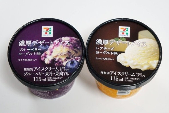 这是两款以含活性乳酸菌的酸奶为主的冰淇淋,左是蓝莓(含蓝莓果粒)酸奶口味,右为起司酸奶口味。蓝莓口味210日元(税込);起司口味205日元(税込)。