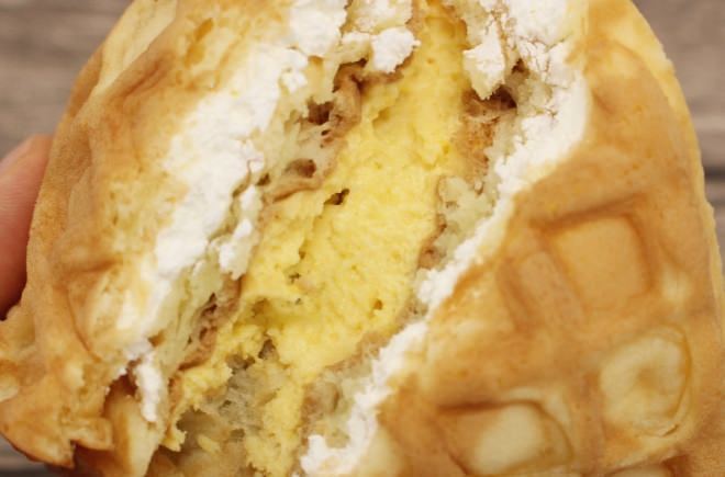 3层华夫饼、2层奶油。咬下去,湿润的华夫饼与奶油相结合在口中融化,甜蜜醇厚的口感蔓延~