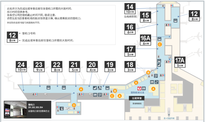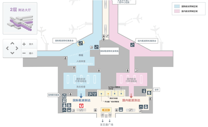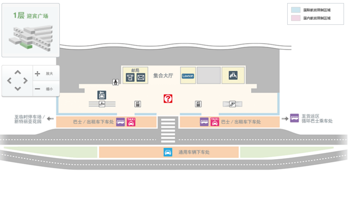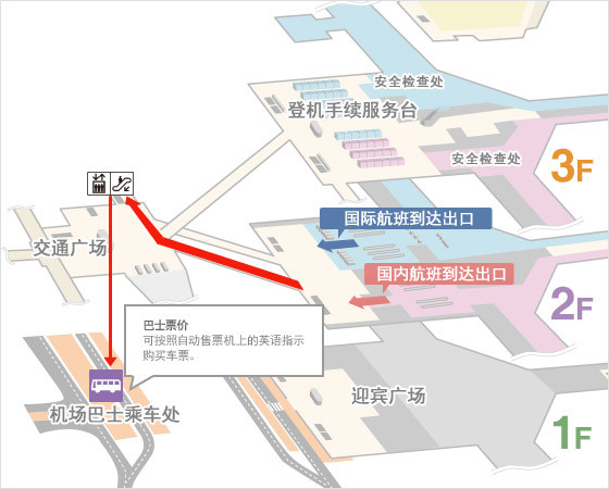 机场巴士在航站楼1层下客。登机旅客请至3层,接机的旅客请至2层。