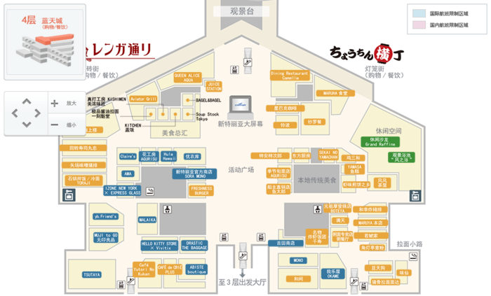 位置:4层 蓝天城(购物/餐饮)、3层 出发大厅、2层 到达大厅、交通广场