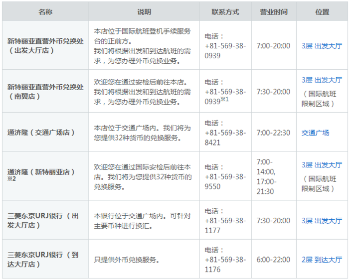 在名古屋国际机场只有一家银行,三菱东京UFJ银行营业厅,会提供银行业务及外币兑换服务。主要币种进行换汇。