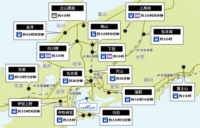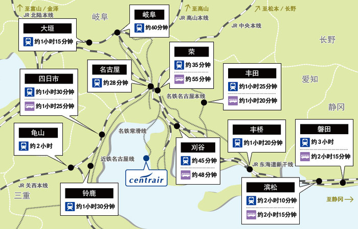 中部国际机场的交通得天独厚。30分钟即可从机场直达名古屋站,在名古屋站搭乘新干线,数小时内便能抵达京都、富士山等旅游胜地。