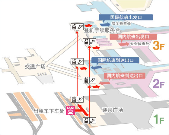乘坐出租车的旅客请在航站楼1层下车。登机旅客请至3层,接机的旅客请至2层。