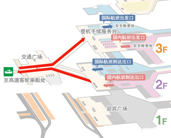 轮渡码头与航站楼之间设有连接通道,建议您经由交通广场的连接通道前往客轮所在泊位(步行约15分钟)。