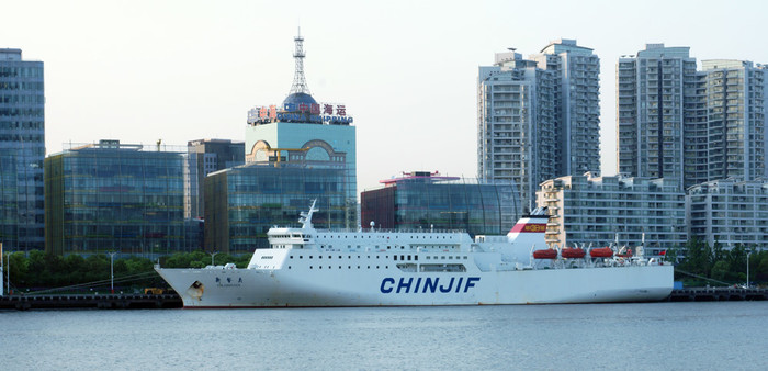 “新鉴真”是中日国际轮渡有限公司旗下的。总吨14543吨,全长156.69米,设计航速23海里,服务航速21海里,每周六从上海出发,每周一抵达日本大阪,海上航行43小时,是中日海上快速客货定班轮。