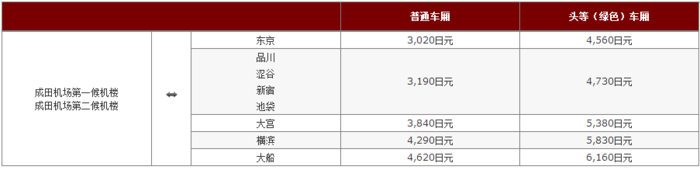 票价:从成田机场到东京普通车厢是3020日元,头等车厢是4560日元。