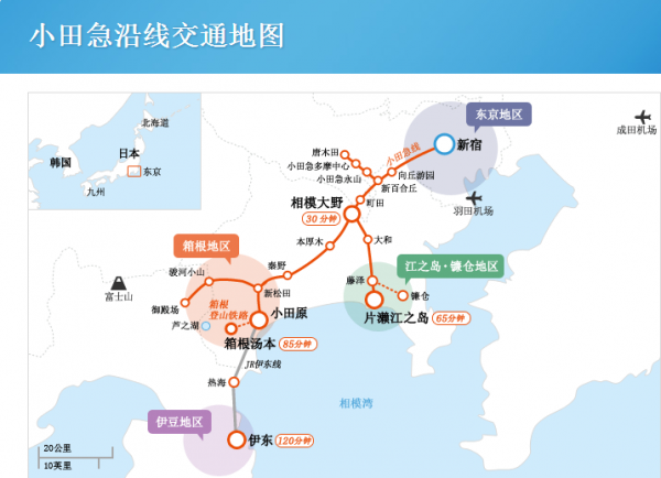 小田急电铁主要连络东京西南的小田原地区和多摩地区,拥有小田原线(新宿-新百合丘-相模大野-小田原-箱根汤本)、江之岛线(相模大野-片濑江之岛)及多摩线(新百合丘-唐木田)。其中运营的的“浪漫特快列车”最为出名。