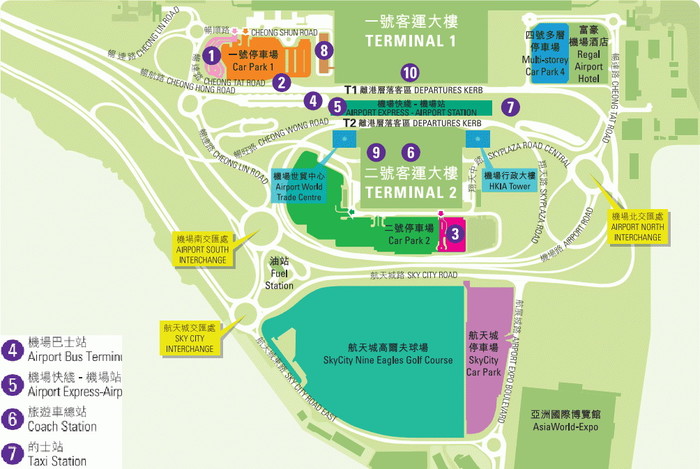 机场的地图,我把大家可能会用的几个大的地方标出来了,因为我们住在尖沙咀新天地,(可能很多人会选择这一片吧)从T1出来后,我们朝着右边走去就到了机场大巴的地方了,很容易看到