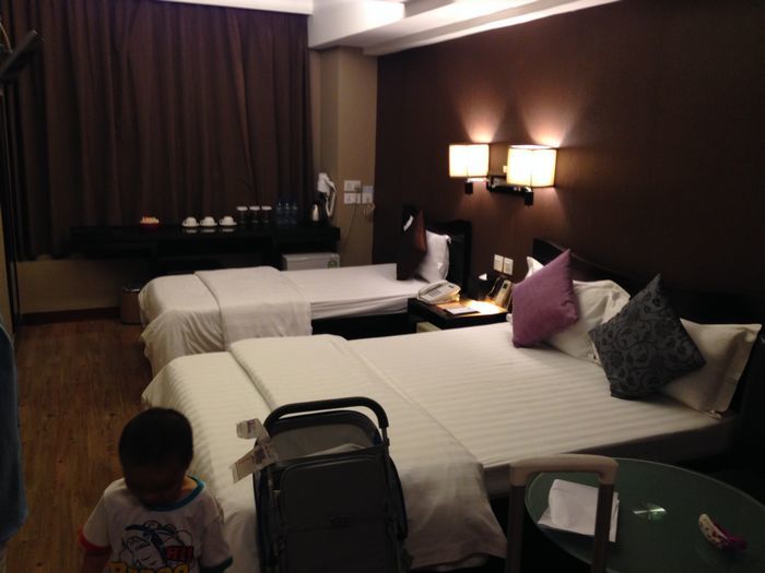 我订的是这个酒店的家庭房,一个大床一个小的,因为我们三个大人,要是分2个房不划算不说,也不方便照顾小孩子了,所以在网上找住的地方真是废了不小的功夫,想找个大点的,安全点的地方,香港的地真是值钱,我看了好多房间真是好小好不,家庭房普遍是14平左右,真是放了2个床不是没地了,最后订的新天地,主看着房间有22平,还在尖沙咀警察局边上。一锤就定了。