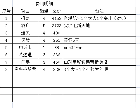 下面正式开始了,这次去香港玩(还去了澳门),3个大人加1个小婴儿2岁不到。一共不带买手表、护肤品和项链的话是花了1万6左右的钱吧,算算是6天,其实有点不划算了。要是和团的话,一个人好像才2-3000这样吧。