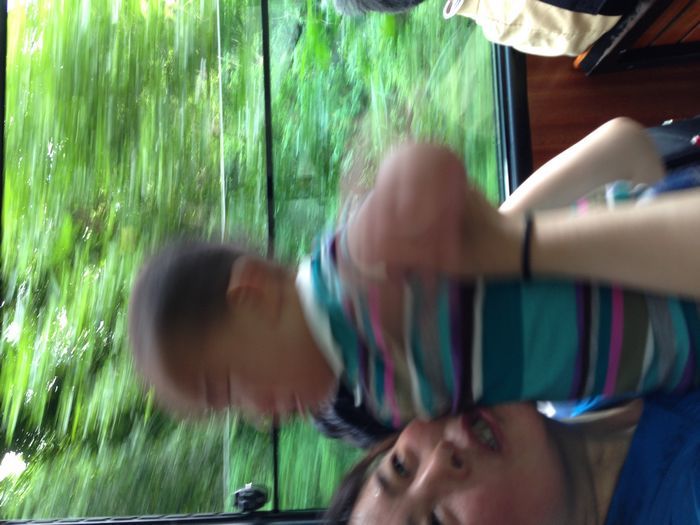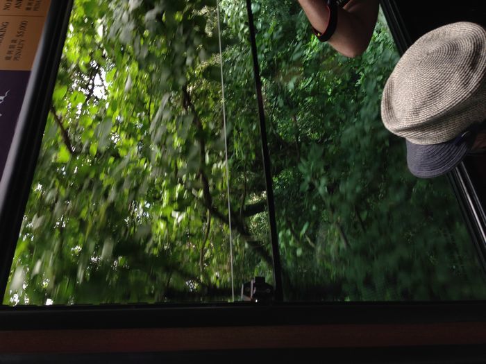 缆车上人不少,还有小部分的人是没有座的,不过风景真的很美,像在丛林里穿梭,两边都是绿的,很多的藤条什么的。很好看。