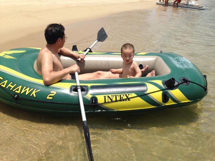 我们走到一个学校下的海滩,这里的沙不太好,很粗,还搁脚,但这不是重点,重点是太阳晒的沙滩超级烫,我们穿的鞋又不适合在沙上走,我们都光脚的,烫死了,想在水里走就不烫了,可是水里走又很累。有10分钟大概就走到了公共浴场了吧,这里干净多了,沙也好一点,边上是用浮球围上的。我们看边上的店里有卖人字拖的,立马一人搞一又,39一双的价格不算便宜,建议大家就穿着拖鞋来吧。还有租穿和游泳圈的地。我们租了个大的船。