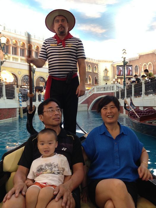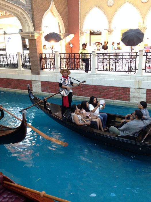 回到码头的车上,我们可能是因为车上很凉快,又改主意了,决定去威尼斯,不去都对不起来回的船票。下了车直奔蓝色的车走去。很明显的车身,这里的车都是一个酒店一个颜色,好像没有重样的,普京是绿的,永利是红的,威尼斯是蓝的。又坐 了有20分钟,下车后和人流一起进入酒店。外面看不出特别。进门后上到2楼就是运河了,我去换了票。就准备坐船了。