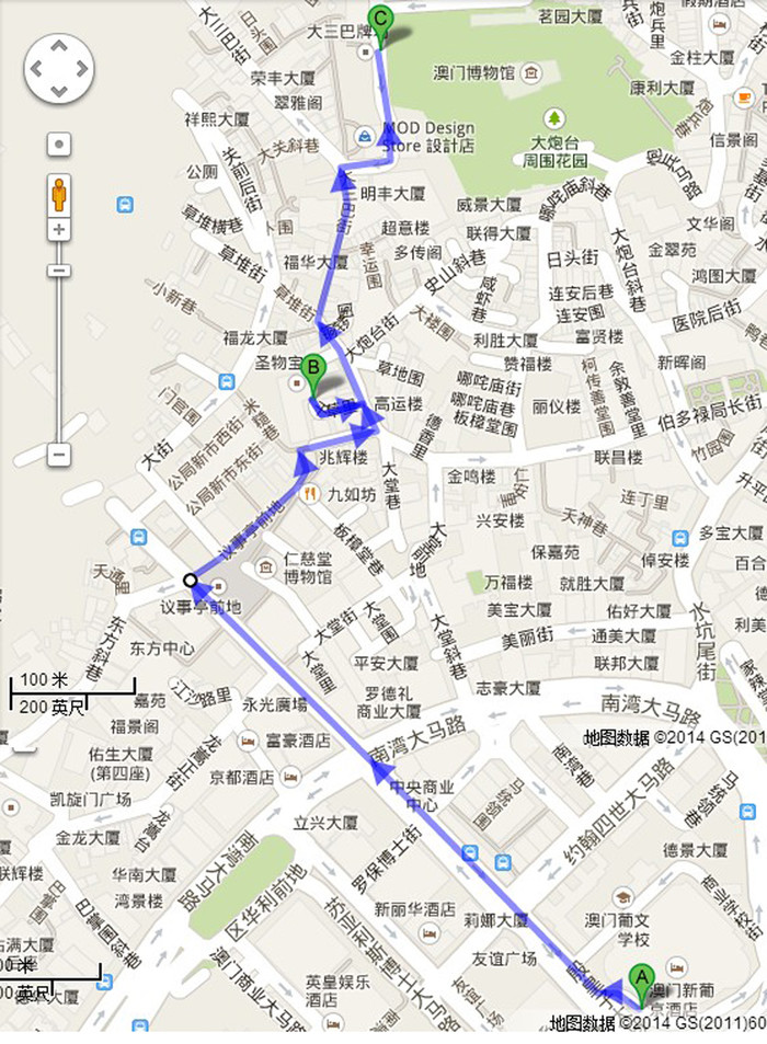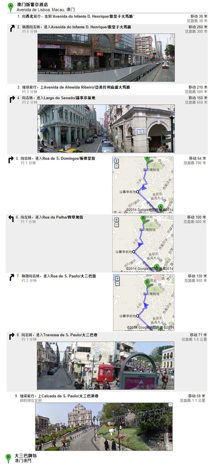 在香港中国客运码头做船到澳门外港码头(160元)整点一小时一班,出了码头大厅,乘坐新葡京的免费巴士(新普京的车,去程是免费上车的,回码头就需要出示票了,这个票呢,跟赌场里的荷官要就行了,新葡京门口到大三巴牌坊的行走路线图。途中会路过民政总署,还有传说中的一路试吃到饱的街。在望前走就是大三巴了,大三巴到此一游后,原路返回,去新普京坐免费的巴士回码头,下车直接去坐威尼斯人的免费巴士去威尼斯人。出威尼斯人坐车去码头回香港。