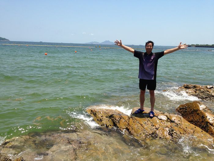 这个地方的水不如长洲的清,但是礁石却很适合照相用,看我老爸开心的拥抱大海。这一段我略过,我没去打扰我爸和我妈的小浪漫,而是在沙滩上带着宝宝。