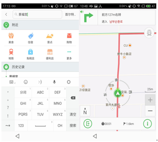 旅鸟韩国地图的数据多且全面。最重要的是可以用中文搜索地点,显示结果是中韩双语,方便对照。而且还有中文语音导航,可以清晰地导航到目的地。