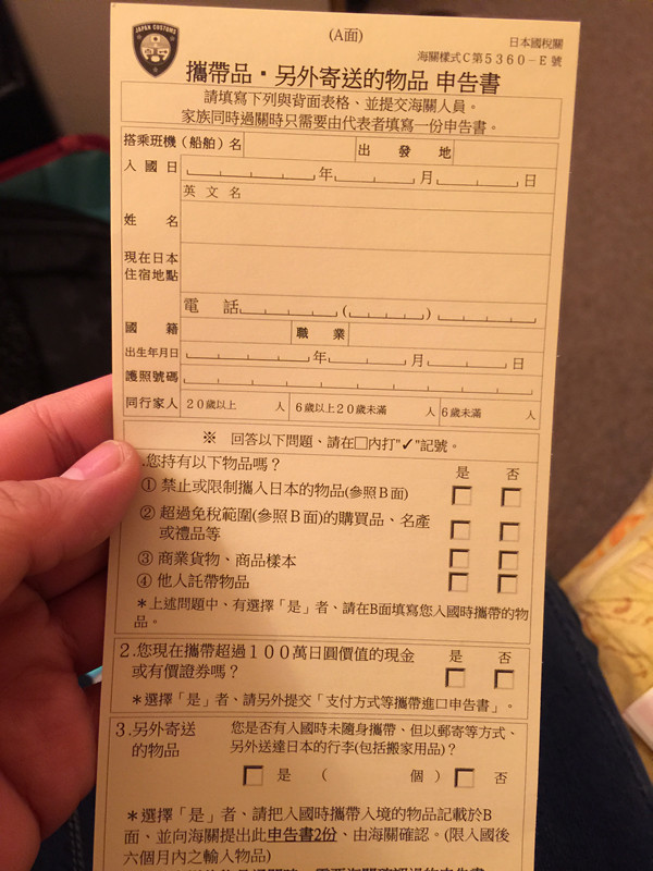 领取行李后,最后还要通过日本海关。海关分红色和绿色通道。没有携带需要上税的物品时走绿色通道,携带有需要上税物品 或是 不能确定的请走红色通道。每人都必须提交携带品分离运输行李申报表。