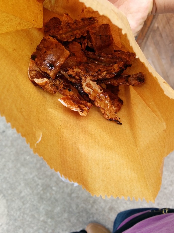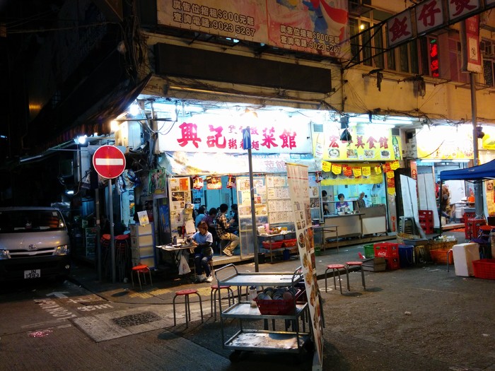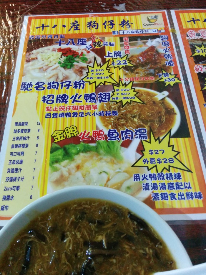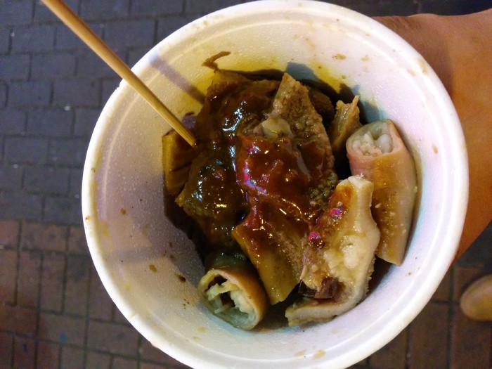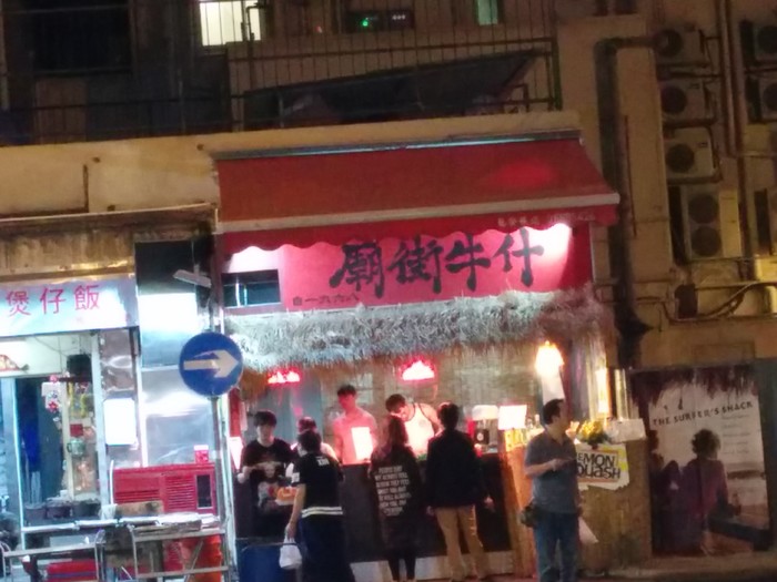 想起晚上还没吃正餐呢,天色还早,还是去庙街转转吧!中途路过一家店,看人挺多,也试了试,算是半个路边摊吧!味道一般般,什么狗仔粉。。。火鸭翅,这是行程之外的东东!
