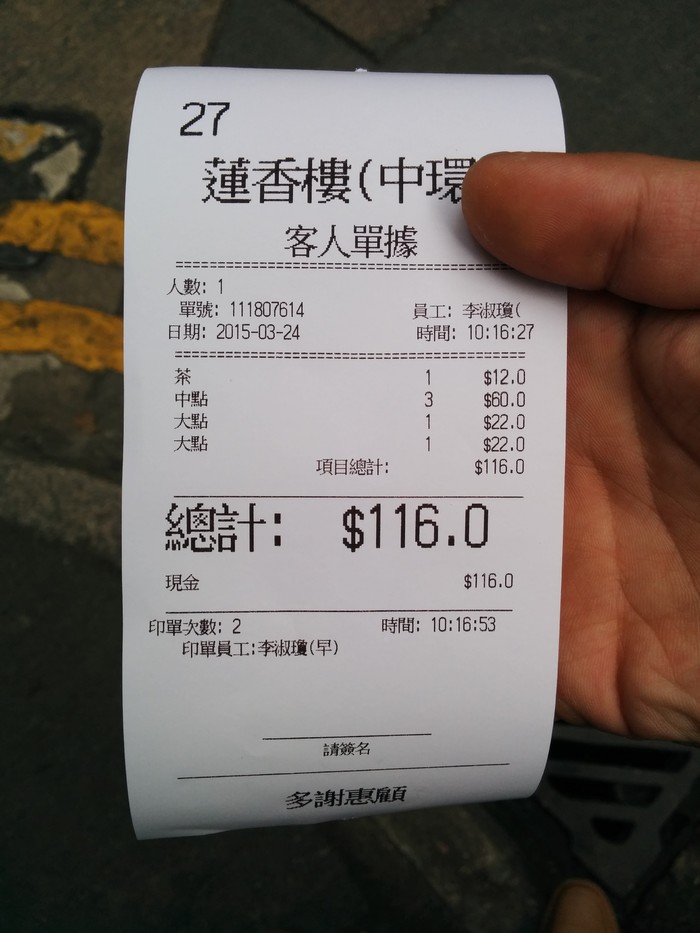 总算有时间喝早茶了,说到港式早茶,可能很多人都会选择去稻香,其实最正宗的港式早茶还是要数莲香楼,莲香楼的格局、环境还是保留老香港的味道,来这里喝早茶的大多是上了年纪的本地人,喝港式早茶是有规矩的,我由于没喝过,所以直接就二了。。。囧,直接拿着人家的茶壶要倒茶,结果同桌大叔连忙制止,并且热心的教我如何饮茶,哎,丢人丢大了。。。避免大家和我一样尴尬,还是说下饮茶规矩吧!首先你得先找到位子,人比较多拼桌是正常的,在落座之前最好先问下同桌的人可不可以拼桌?一般情况下都是没问题的,然后让伙计拿张票,就是吃东西盖章最后结账用的,然后叫他倒茶,茶具有两种,一种是茶壶,另外一种是茶盅,香港本地人一般用茶盅,不过我劝各位还是用茶壶比较好,茶盅估计很多人用不来,另外茶是可以选的,我不懂选了龙井,其实喝早茶最好还是选乌龙,因为吃的东西也有点油腻嘛,所以乌龙茶更好,另外碗筷杯子你要自己洗一洗,莲香楼的卫生环境只能说一般般了,茶壶的水如果没有了,你把茶壶盖打开,伙计看到就会给你加满的,接下来就是点东西了,人比较多,你不需要傻乎乎的坐在位子上等他推过来,你自己过去挑,挑好了盖章自己端过来就好了,份量都蛮多的,由于图新鲜我点的太多了,吃不完。。。囧,不过最后结账的时候也才一百多点,不贵感觉还挺划算的!呵呵!吃完后拿着那张票到门口结账就好了,好像不能刷卡,(我记不清了因为港币带的不多所以能刷卡的时候我都会刷卡,后面的结账单是现金,所以我推断当时不能刷卡)所以就用港币了!另外茶位费12块哦!