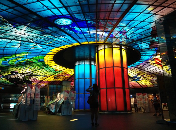 列车进入台北市中心后,走的是地下,这下子就真的变成地铁了,到达台北车站后,从地底下上来,首先迎接我们的就是就是这个大厅,非常宏伟的一个车站大厅,台北车站是及高铁、台铁、捷运、大巴于一体的大型综合类车站,所以整个车站真的很大。。而在这里,我再一次体会到宗教在台湾的影响力,一幅几层楼高的《心经》就这么悬挂在台北车站这个大厅的墙上,观自在菩萨,行深版若波罗蜜多时。。。。