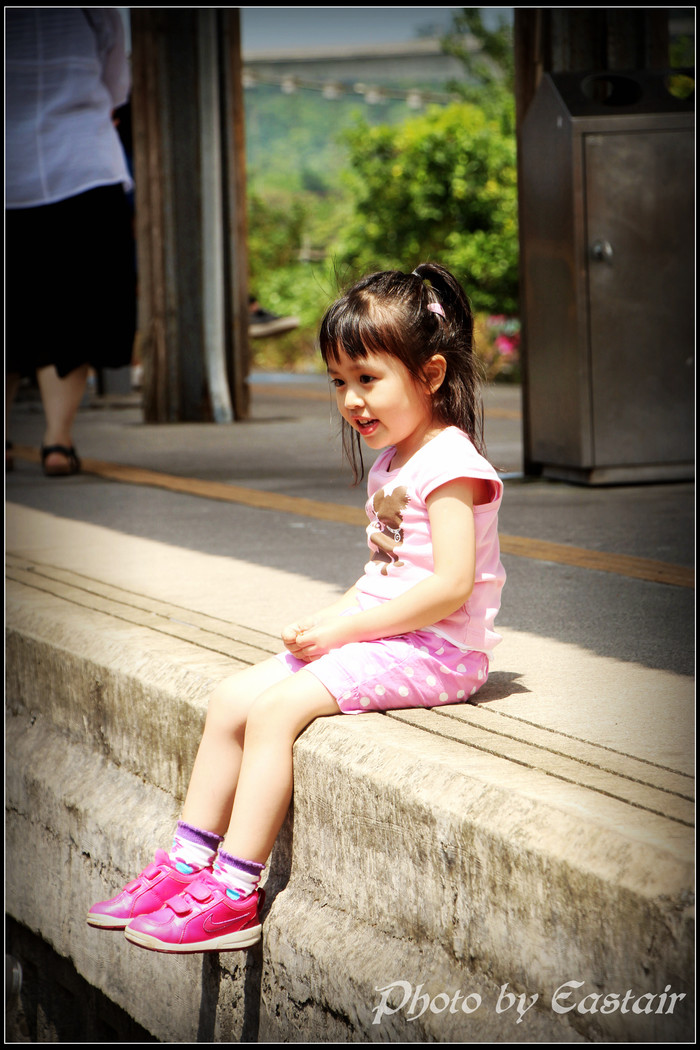 在车站的月台,这位可爱的小妹妹坐在月台等待她父母为她拍照,我随手拿起相机,也拍了一张,没想到在火车里往下一站去的时候,他们一家就坐在我旁边,于是我向她妈妈要了邮箱,照片已经发给他们咯,哈哈,来自香港的小妹妹