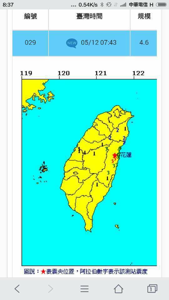 说个小插曲,火车7点38分准点从花莲火车站开出,7点43分花莲就发生了4.6级地震,说实话,去台湾之前就知道地震在台湾是常有的事情,花莲是高发地,前一天一日游的司机也说,对于花莲人来说,5级以下的地震都是无感地震了,对于我来说,如果对生命没有造成威胁,还真想小小的体会一下地震,但这时我是在火车上,火车上的小地震,我是完全感觉不到,但微信群上小伙伴们都炸开了,这个说床在抖,那个说大地在抖,我赶紧上台湾气象局的网站上一查,这是台湾今年第29个地震,4.6级,震中就位于太鲁阁内,落石必定增加啊!!