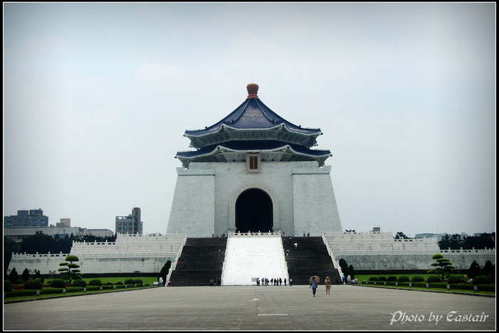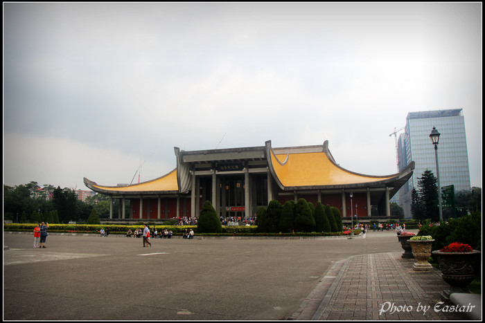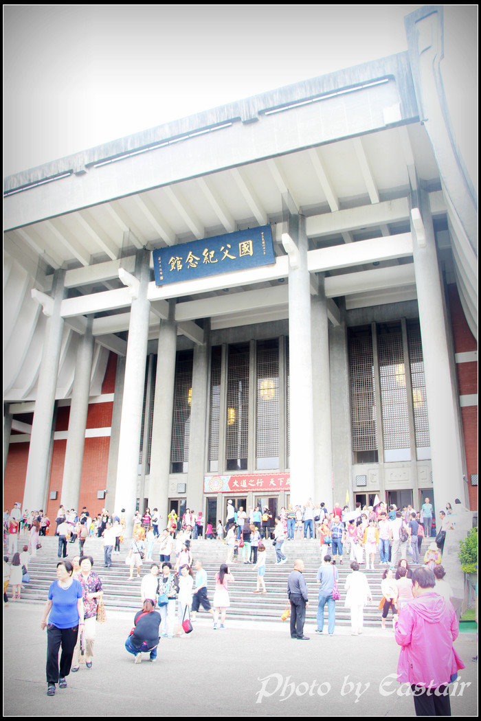 不用多久的车程,我就到达了国父纪念馆,由于不能骑车进去,我只好把车停在纪念馆外面,步行进入园区,而就在纪念馆大楼的门口,很多人滞留在那里,一开始我还纳闷是发生什么事了吗?怎么那么多人站门口不进去?后来发现,他们的视线都向着一个方向,而且通常都有手机或相机等摄影设备,我背过身一看,原来这里也是一个很好的拍101的角度,但这样守着孙中山的门口,真的好吗?