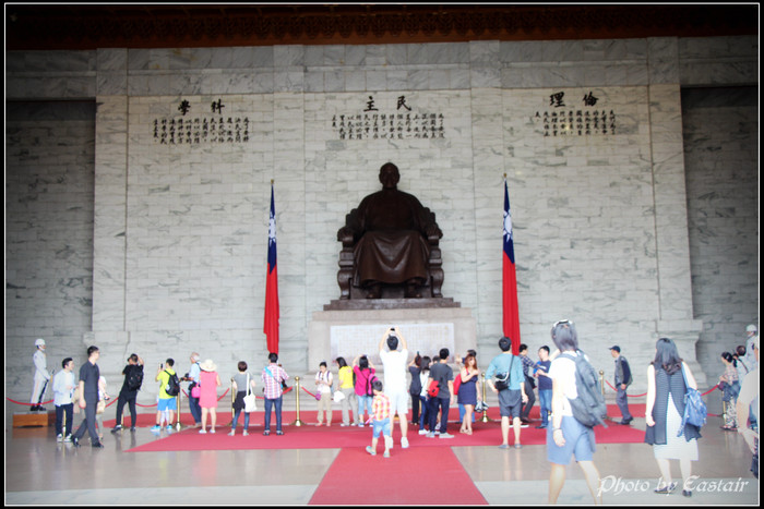 而中正纪念堂,之前一直都是在书上或者网络上看到照片,等真正到达这里,才发现,这座纪念堂比想象中要宏伟很多,楼下可以说是纪念蒋介石的一个博物馆,展示了蒋介石的事迹,以及他曾经用过的一些物品。楼上则展示着蒋介石铜像以及他对伦理、民主科学的见解,并由两名卫兵站岗,卫兵每个小时整点的时候进行交接换班,交接仪式大约15分钟,卫兵从到达一楼开始则以正式的步伐进入纪念馆,甚至上下电梯也必须遵从应有的交接仪式,还是挺有气势的。
