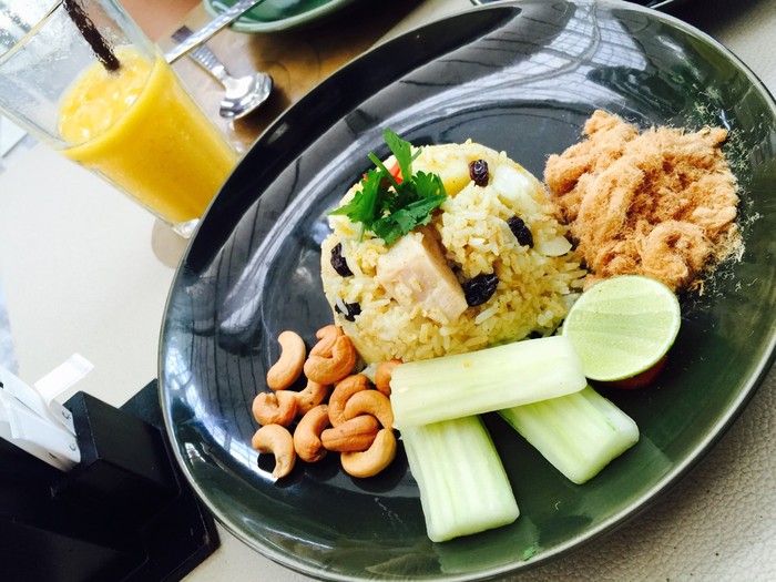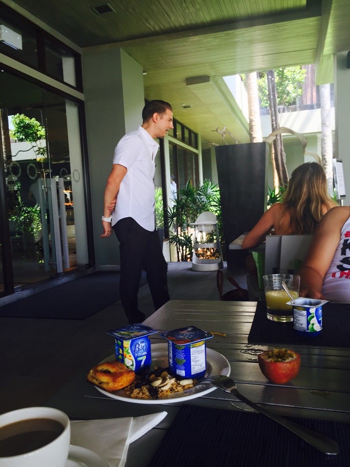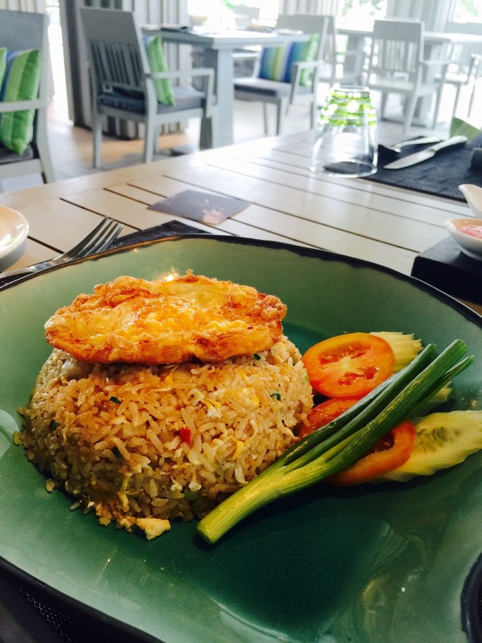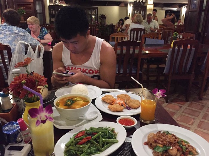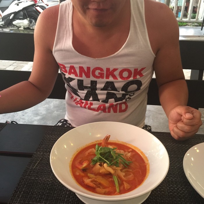 早晨吃了杯泡面就去赶飞机了,到酒店的时候我俩已饿到腿软。奈通海滩人比较少,还不及芭东海滩的五十分之一呢,来的路上也没看到什么餐厅,不想出去觅食。一拍即合,酒店餐厅吃!贵就贵!