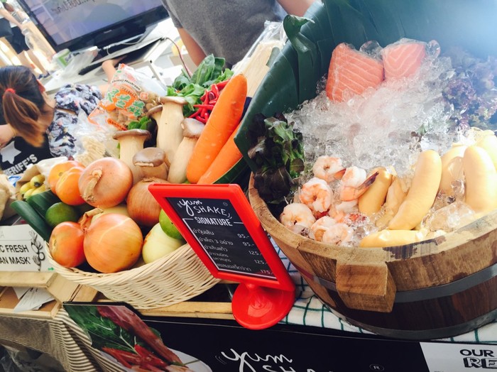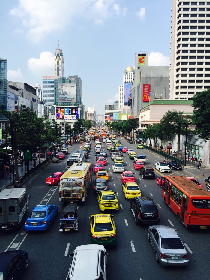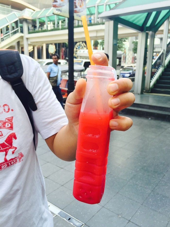 曼谷满大街都是卖这种果汁的小摊,一定要喝,味道非常fresh!虽然很冰,我还是忍不住喝了两口。咳咳……有石榴、芒果、橙子、草莓、柠檬各种口味,30b。休整了一下,从酒店坐突突去考山路,杀价到120b。事实证明泰国不论是的士、摩托还是突突全部都在狂飙。难道泰国没有限速这回事吗?!