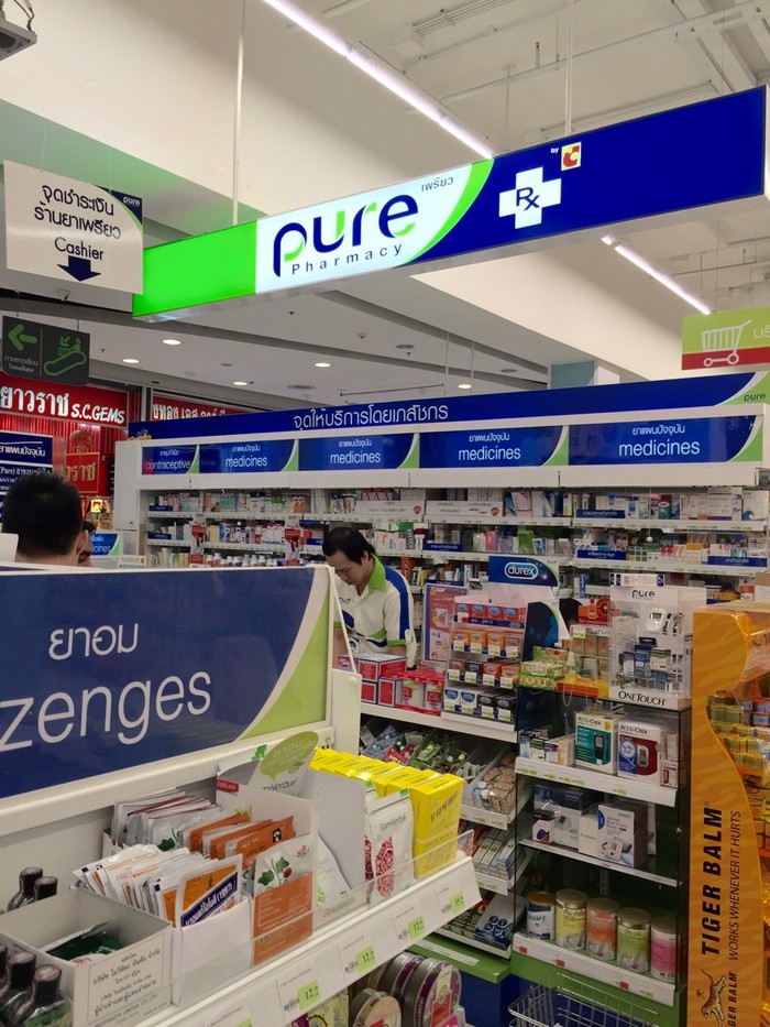我感冒没好一直咳嗽,去Bigc看到药店,买了些喉糖什么的。泰国的药品很有名,有兴趣的同学们可以买些回去,蜈蚣包装的止咳药,青草膏,牙痛油,虎牌药膏都有。我后面还要去普吉、清迈,购于打算放在最后一站。