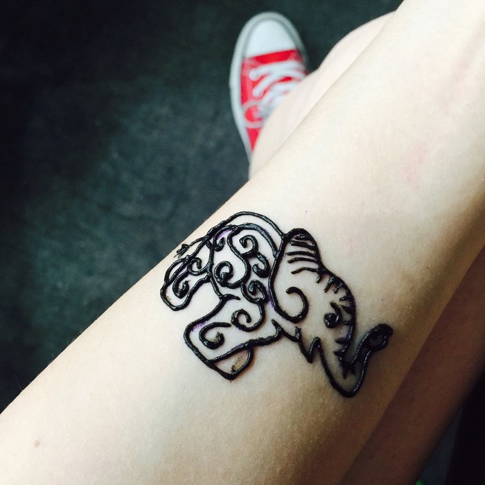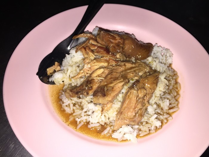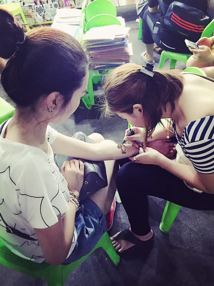 纹身在汉娜画的,要等四十分钟完全干了才能洗掉。老板说能保持两周but在曼谷这种一天不洗两次澡就会死掉的城市,能保持五天都是不错的。原本计划晚餐在考山路吃,实在没找到合意的餐厅,于是又突突回酒店了。酒店门口左转大约二十米有个大排档,是几个大婶在经营,很简陋人却不少,我们决定就在这里解决。菜单没有图片看不懂,大婶们累了一天看起来心情不太好,基本不懂英文。就说随便,我们也不知道她们究竟会做出什么东西来…结果味道还不错,绿咖喱炖鸡和冬阴功汤面,总才共160b!