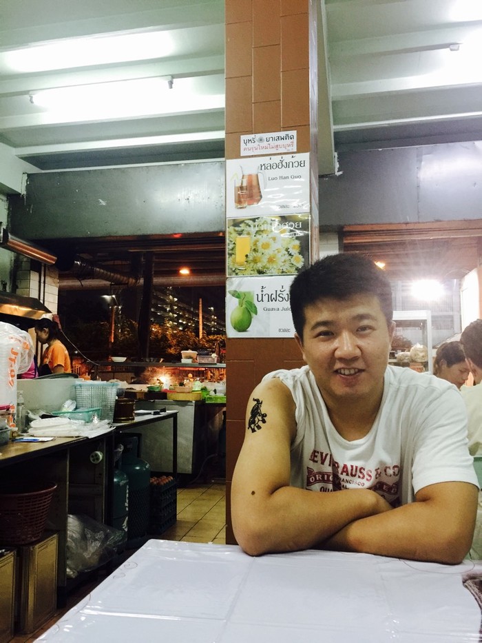 我老公一直耿耿于怀他的纹身不够霸气侧漏,看一次笑一次,哈哈…上图就是等饭的时候在大排档拍。晚餐后在楼下的7-11买了些零食就回房间休息了。