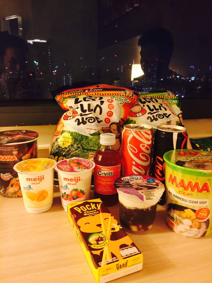 买了一堆传说中很便宜很好喝的muji,发现必须要冰的才好喝。我们住在16层,房间不大,标准的快捷酒店配备,能看到曼谷夜景。房间每天提供两瓶免费饮用水。