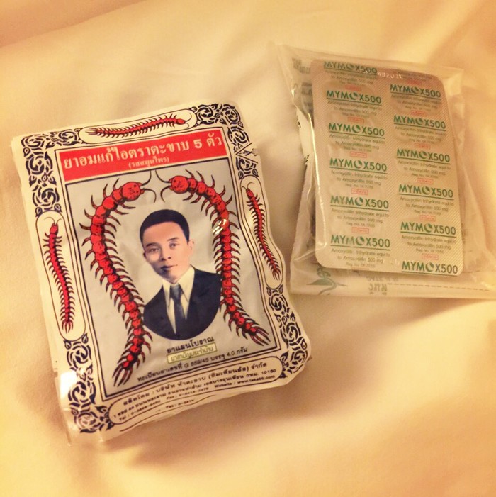 从T21打车去BAIYOKESKY,跟司机说bymeter他居然同意耶,只花了50+b就到了,比突突划算多了(前提当然是不要太堵的情况下)换票之前老公说去买东西让我在楼下等,他回来时竟然帮我买了药,小感动~我问他怎么跟药店店员沟通的,他说就指了指嗓子,然后咳咳咳…-_-也太呆萌了。我一看拿回来的果真是阿莫西林。哈哈。因为这几天已经咳出了八块腹肌,我决定自己再去买点止咳药,我跟店员说了一下病情,问她这里很有名的那种大蜈蚣包装的止咳药是否适用,她说可以的。于是我买了一沓,一共170b。晚饭后吃了一次,第二天咳嗽真的缓解了很多!