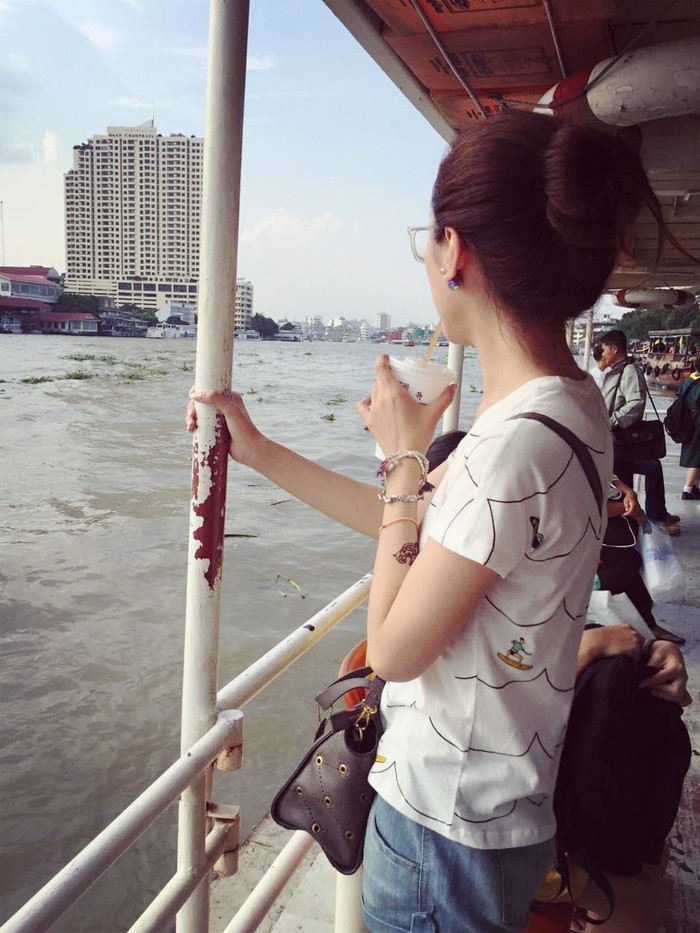 接下来打车去了湄南河,一样很便宜,几十b。司机以为我们要过河,把我们载到渡口。既然到了渡口,就坐轮渡过河吧,轮渡3b/人。湄南河有够浑浊的,两分钟就到河对岸了,渡口连接着集市,集市混乱嘈杂,卖衣服食品食物什么都有,有点脏脏臭臭…买了一包小菠萝就坐回对岸了。