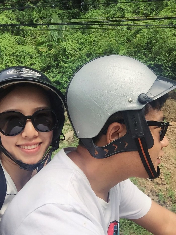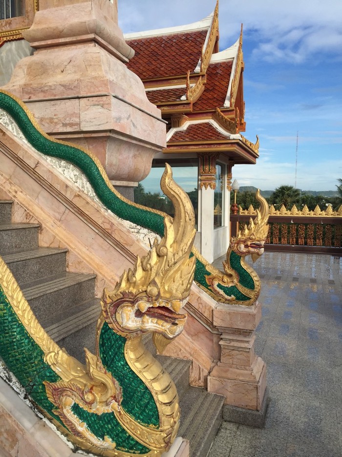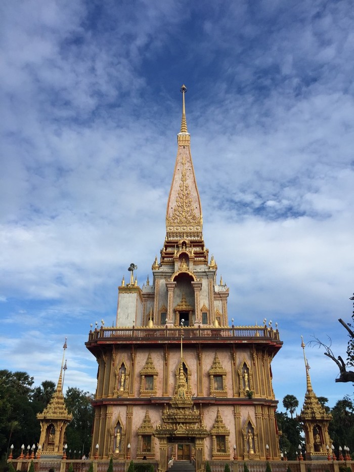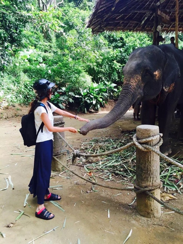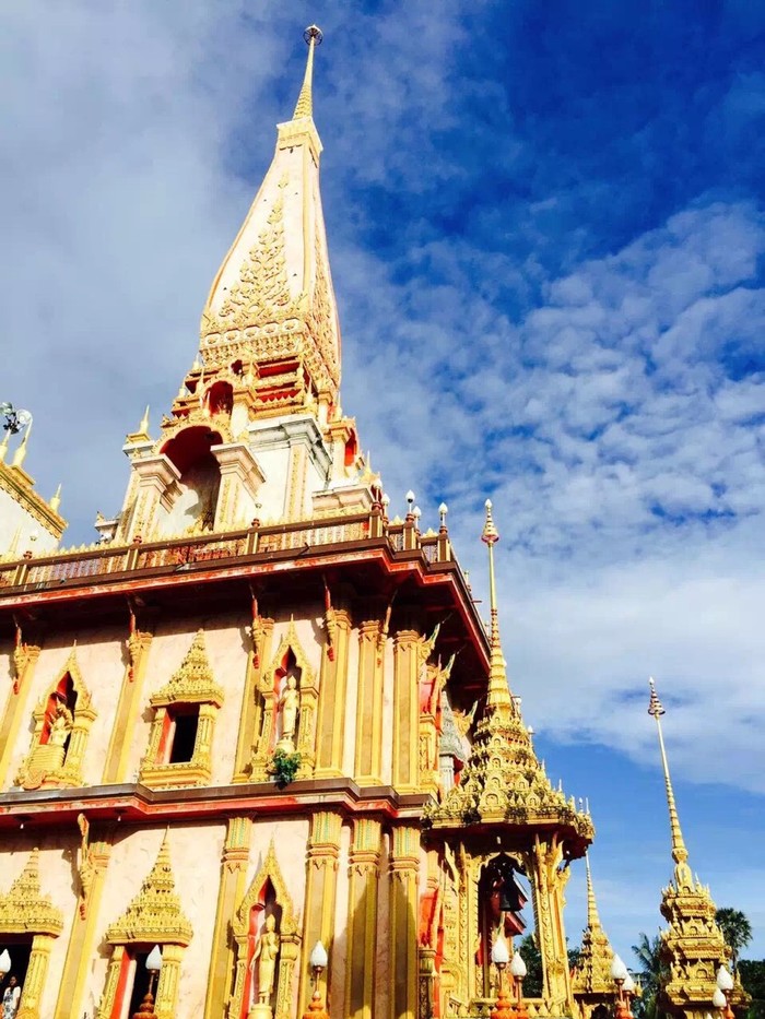 我本来只想跟最高的那个美女合影的,结果突然从旁边跳出两只,长得像左右护法似的…害得我给了三份小费,哼!隔天,老公带着我,我带着钱,骑摩托车环岛去咯。本来觉得有点不靠谱,因为不知道路况怎么样,担心骑一半儿没地儿加油什么的。。。管他呢,走起!!!芭东→卡隆→卡塔→拉威→查龙寺。山路沿海,微风拂面。路遇大象营,观景台…一路走走停停,不同的海岸线,不同的美景。