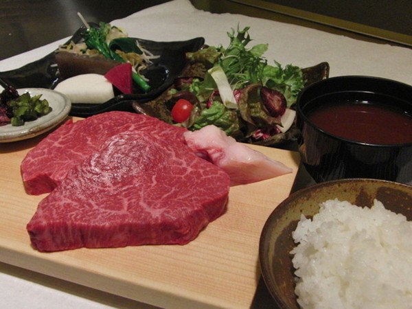 一楼是和牛生肉贩售,二楼是和式餐厅。主要是和牛铁板烧,价格与牛肉的等级成正比,外加10%的服务费。套餐除了牛肉以外,还有配套的季节蔬菜、茶、饭后甜点。烤熟的肉,滑生蛋液吃,一点也不腥,好赞!午餐相对比晚餐便宜将近一半。