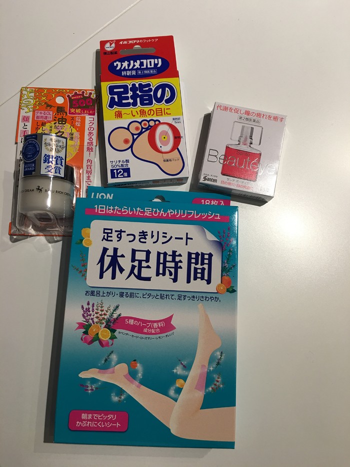 左起:马油,鸡眼膏,眼药水中的爱马仕,休足时间