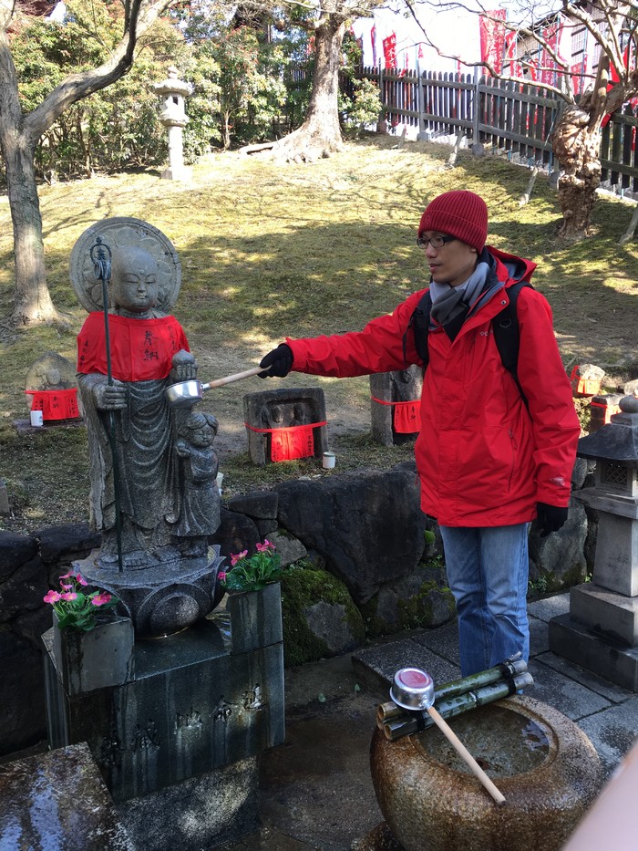 每个寺庙入口都有手水舍,右手拿勺洗左手,左手拿勺洗右手,然后右手舀水倒在左手漱口,不可以直接用勺喝水漱口。
