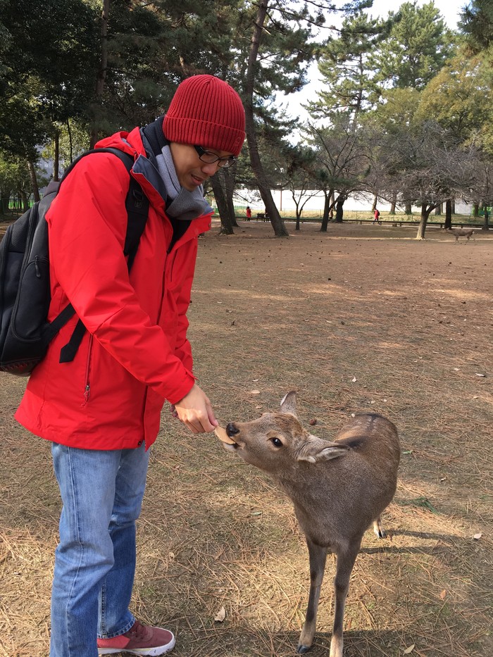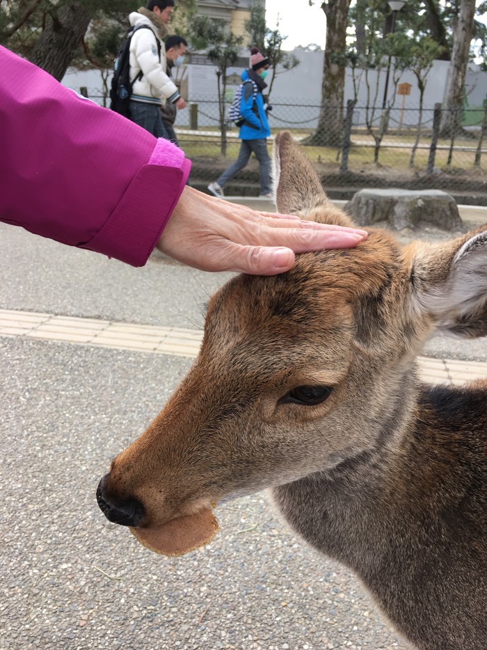 1. 买了鹿饼之后找老板要一个小袋子装,迅速塞进书包里,不要喂那些早就守在鹿饼摊附近的鹿;2. 没有鹿饼或者不想喂了,就把两手举高说 ない (发音:na yi ),围上来的鹿就会散开了;3. 尽量找体型小一点的鹿;4. 东大寺和兴福寺人比鹿多,奈良公园和春日大社表参道的人少一些,鹿也比较温柔。