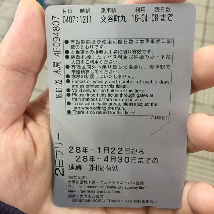 大阪有一日和两日的周游券可以买的,搭乘电车巴士都是任意次搭乘,到很多景点也都可以免费,这个周游卡也可以在大淘宝买到。 第一次使用时,将卡券塞到插入口即可,会自动打上第一次使用时的当日日期的。