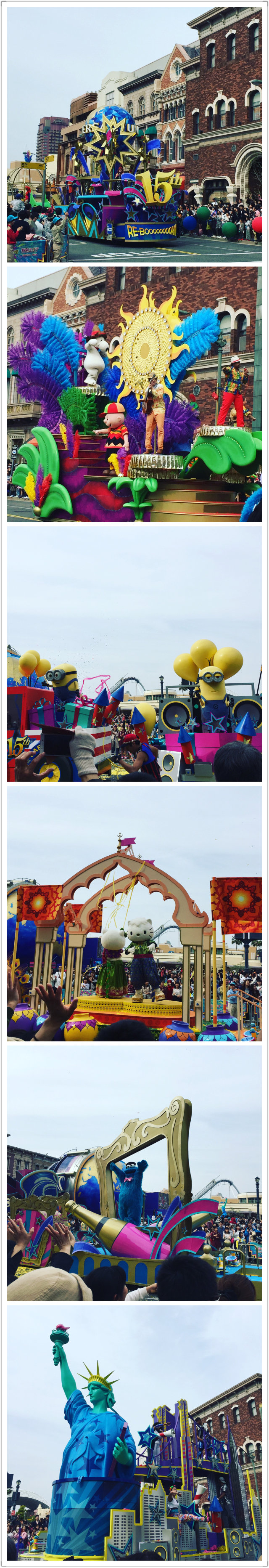 蜘蛛侠玩好了出来,发现好多人坐在地上,然后发现马上就要花车巡游了。先有热场的工作人员带领我们学一些基本的动作,其实我们也都没在认真学,但当花车真的经过的时候,还是真的乱七八糟地跟着蹦跶起来了。
